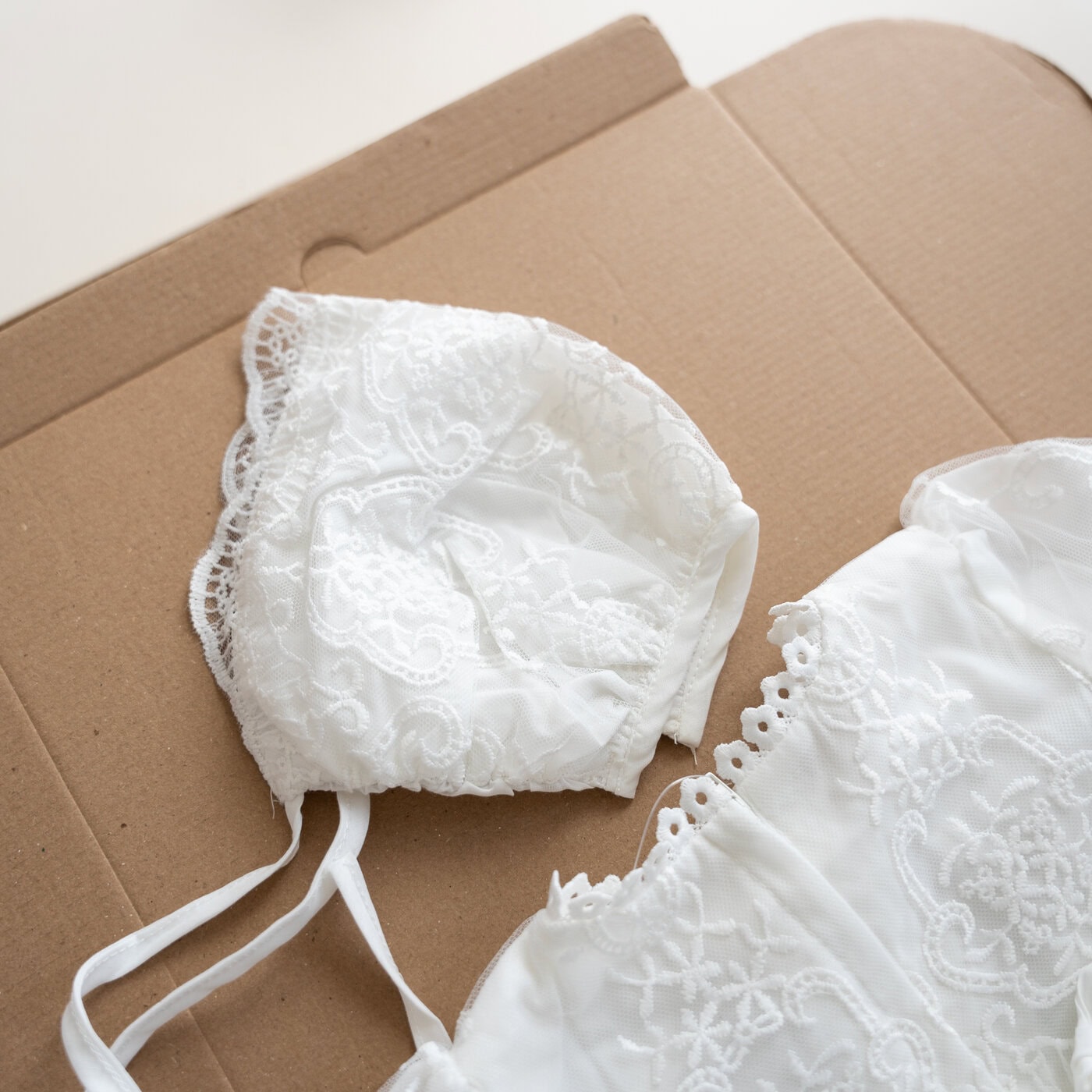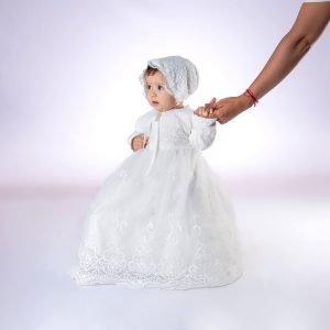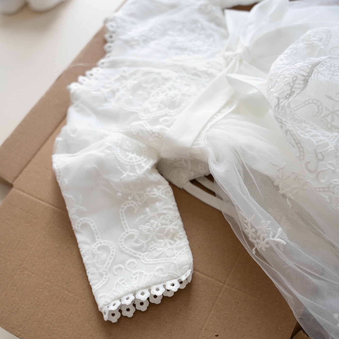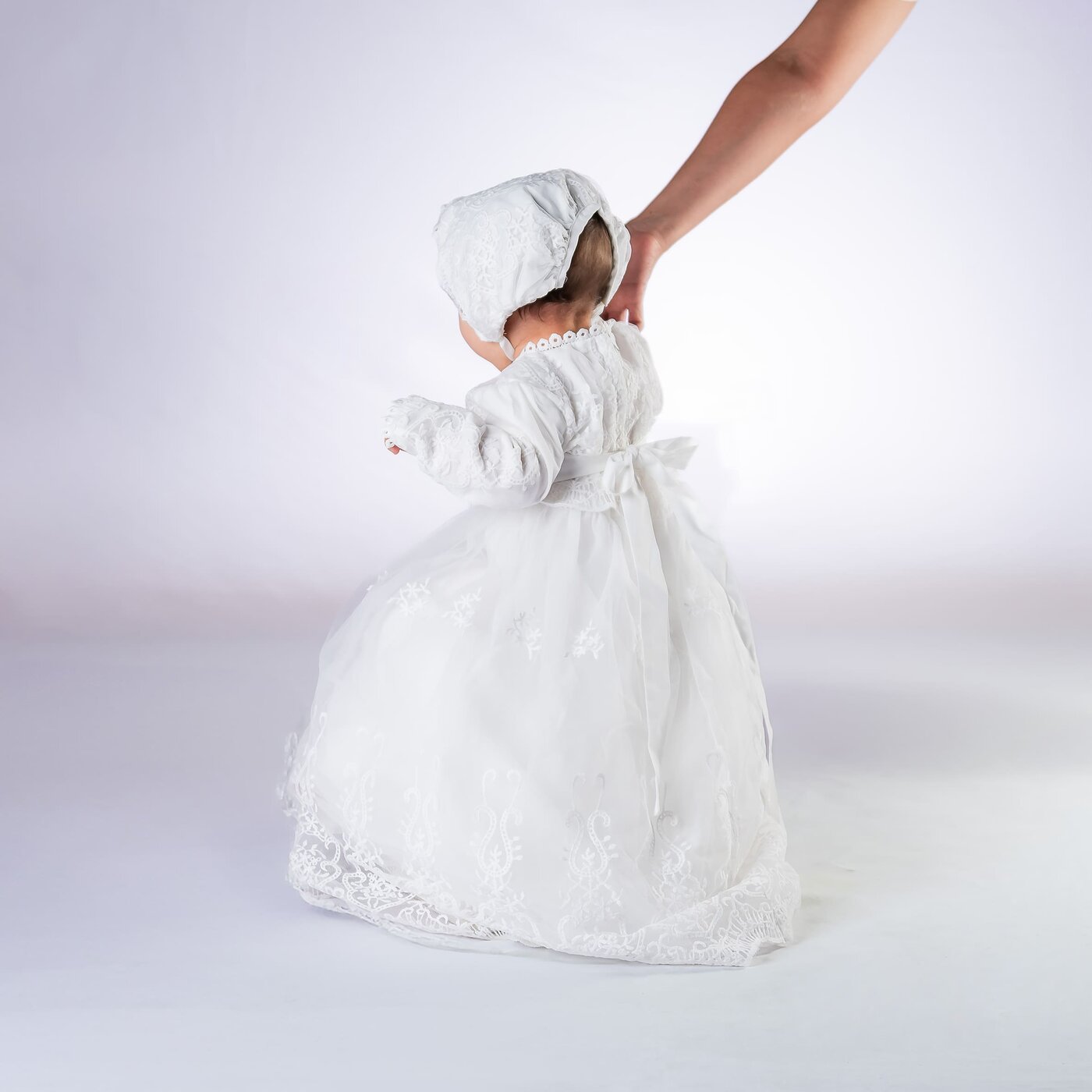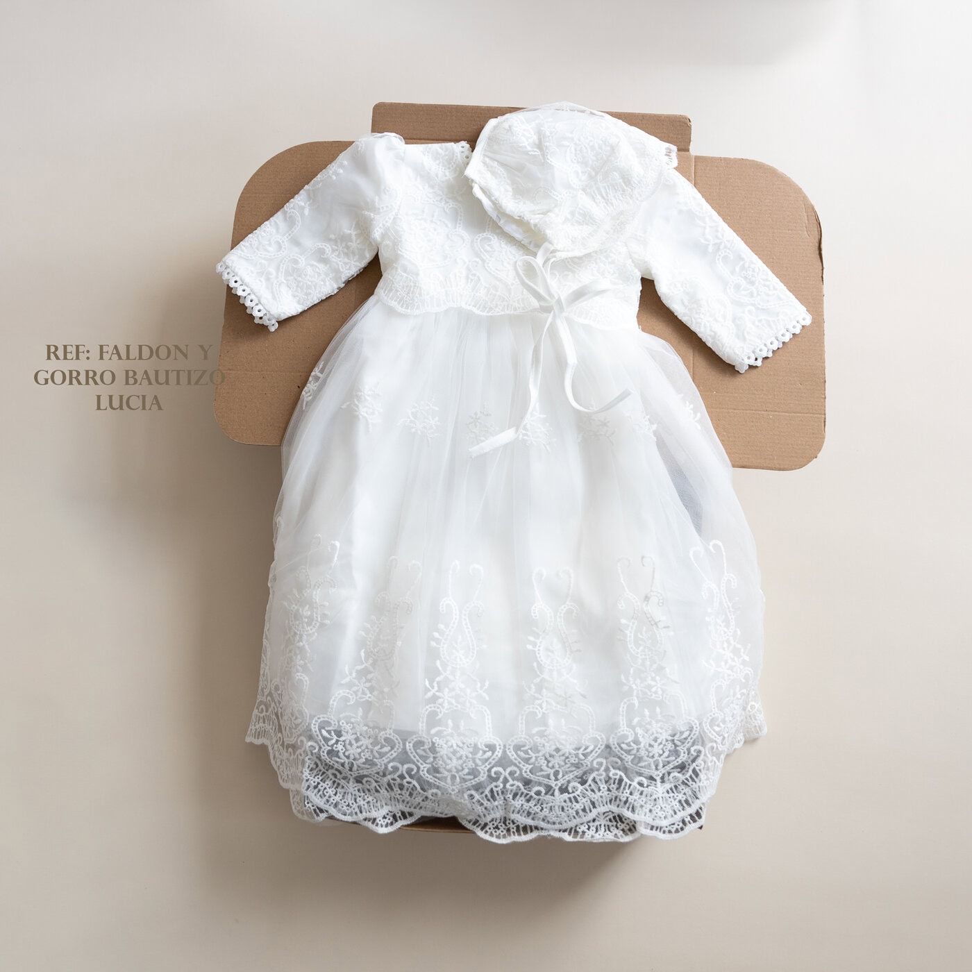 Faldón de bautizo hecho con encaje y algodón suave, ideal para la piel delicada del bebé. Es cómodo, elegante y perfecto para un día tan especial. Incluye un gorro a juego.