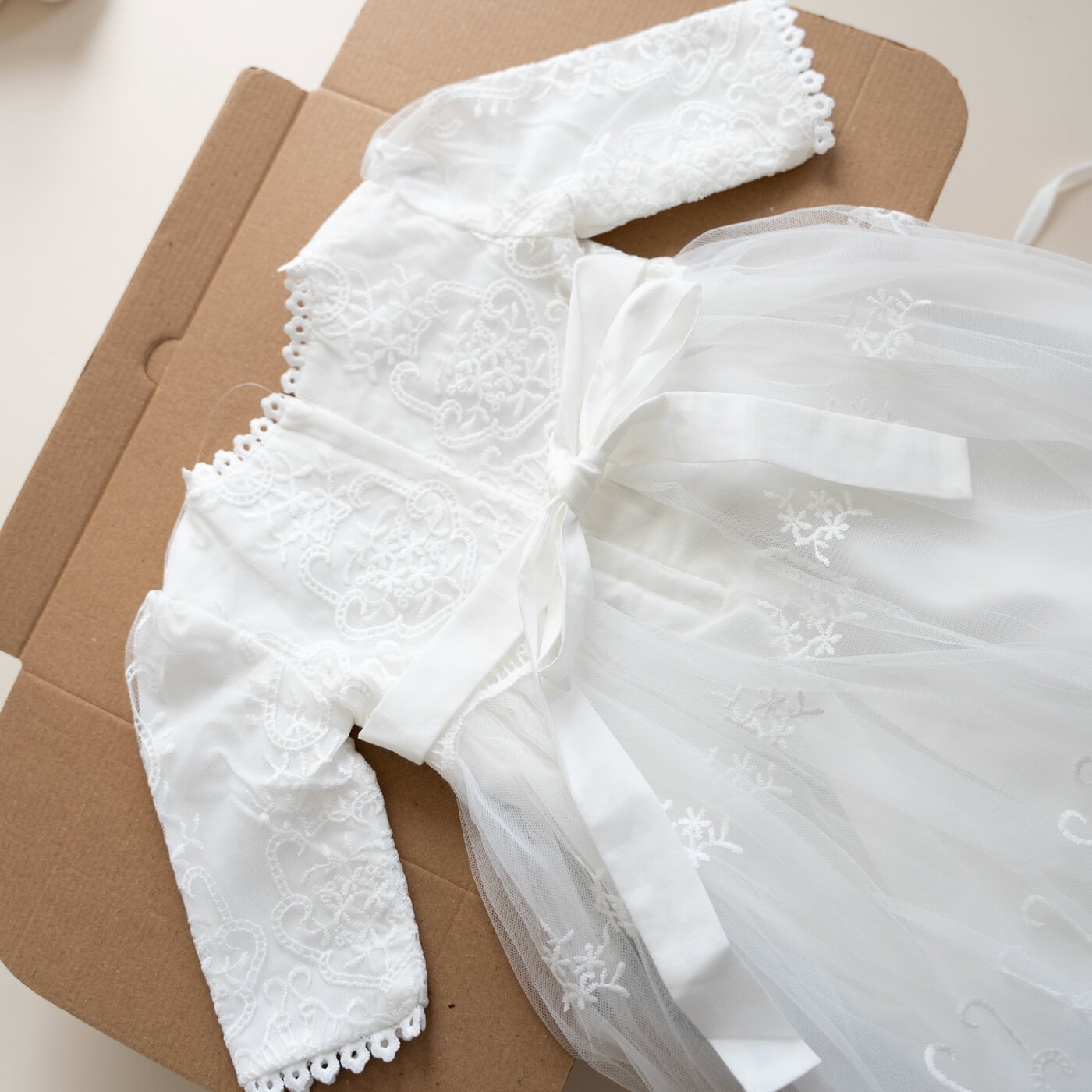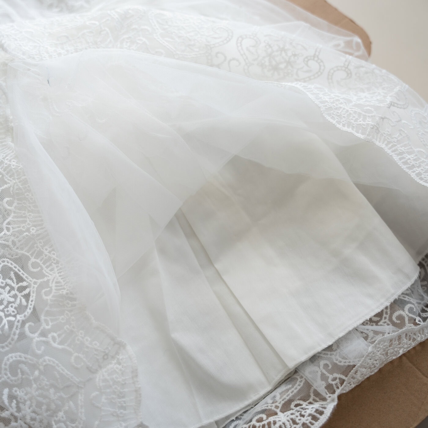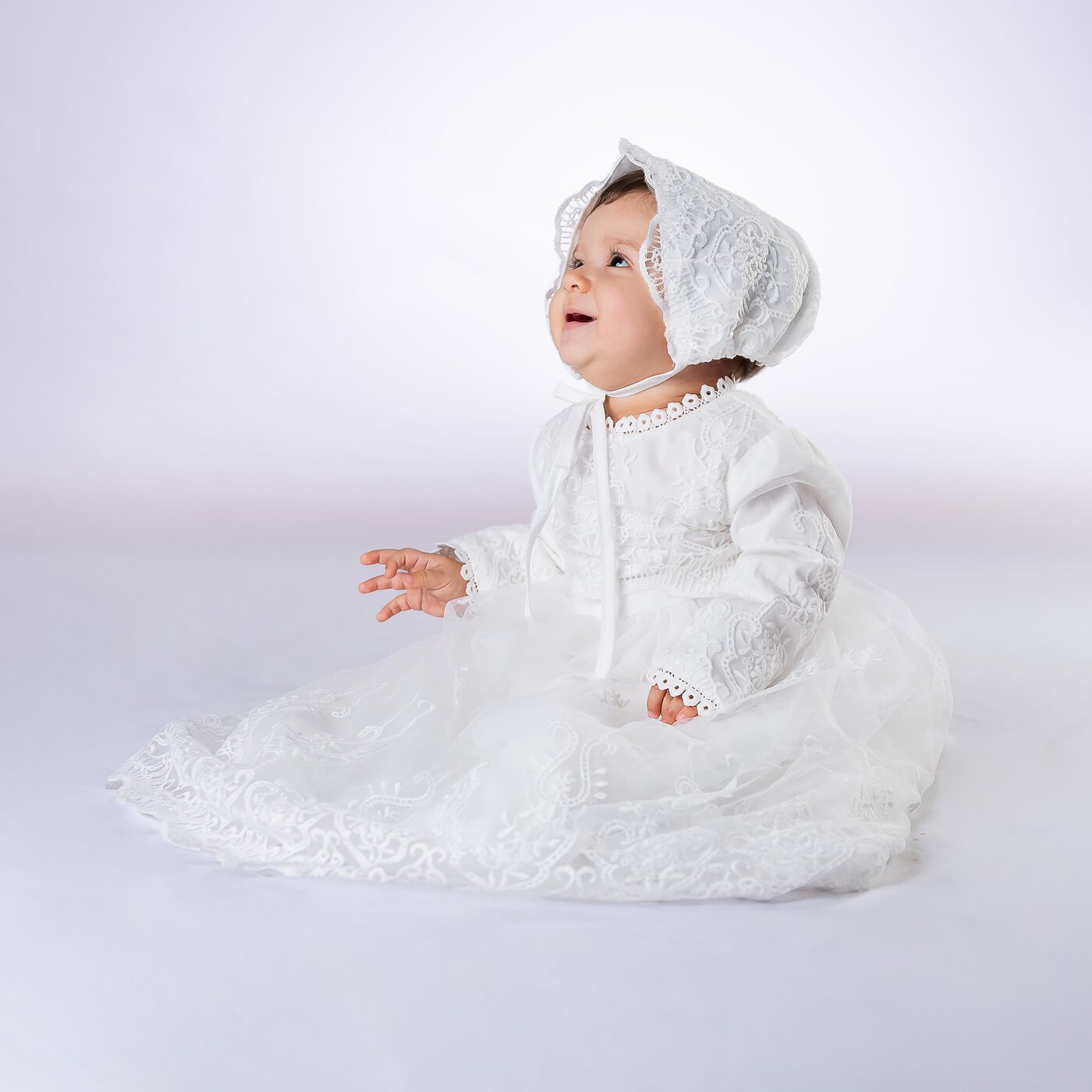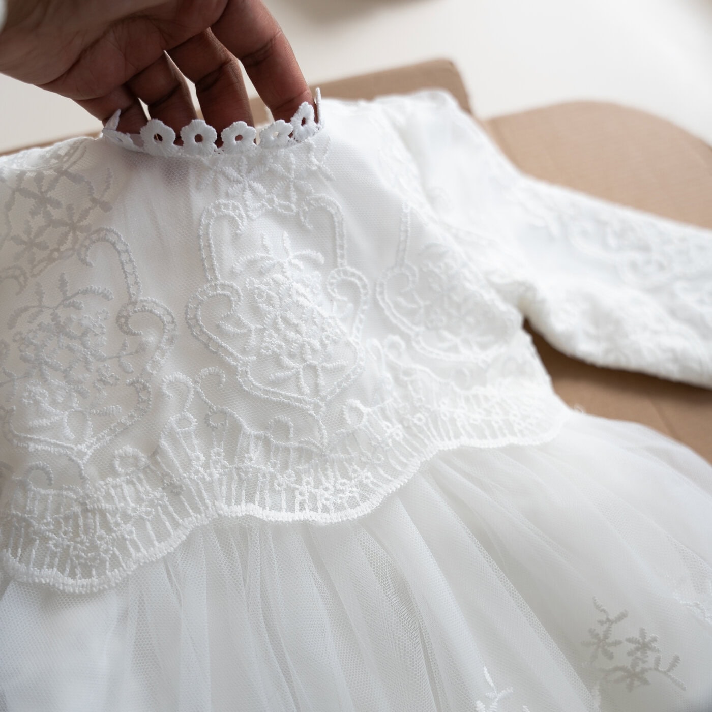 Faldón de bautizo hecho con encaje y algodón suave, ideal para la piel delicada del bebé. Es cómodo, elegante y perfecto para un día tan especial. Incluye un gorro a juego.