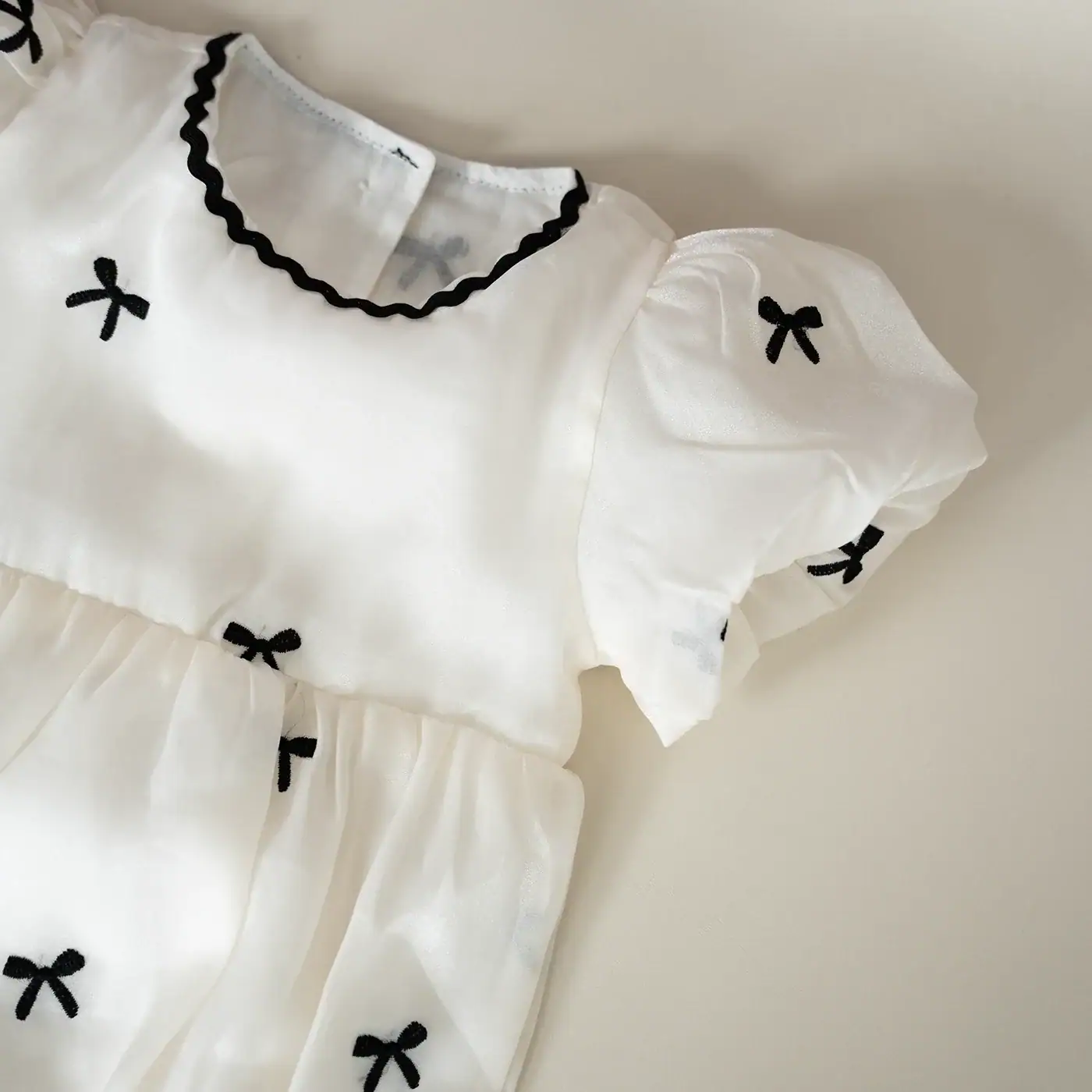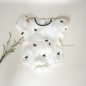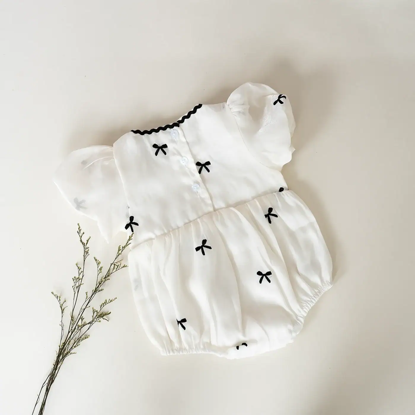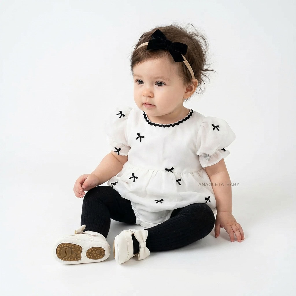 mameluco en tono blanco lechoso, adornado con delicados bordados de lazos negros y mangas abullonadas que le aportan un toque romántico