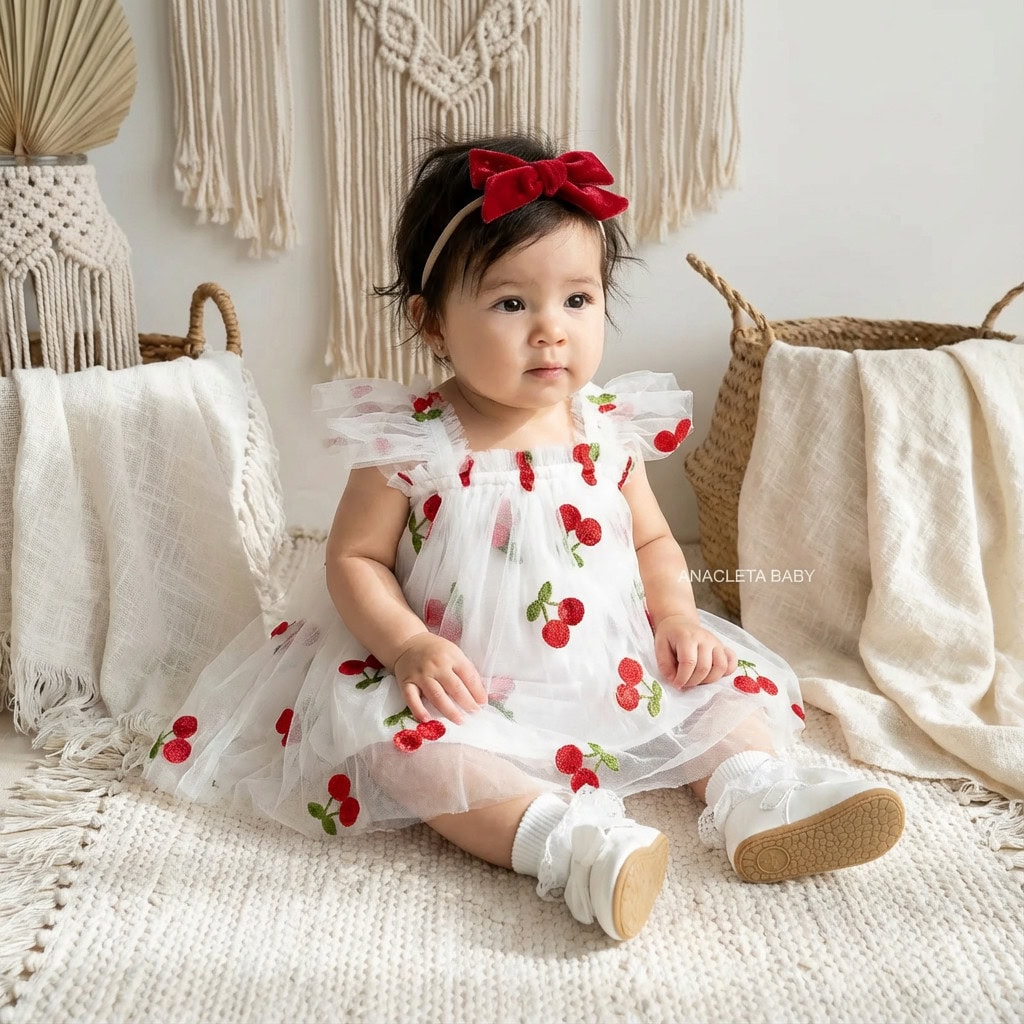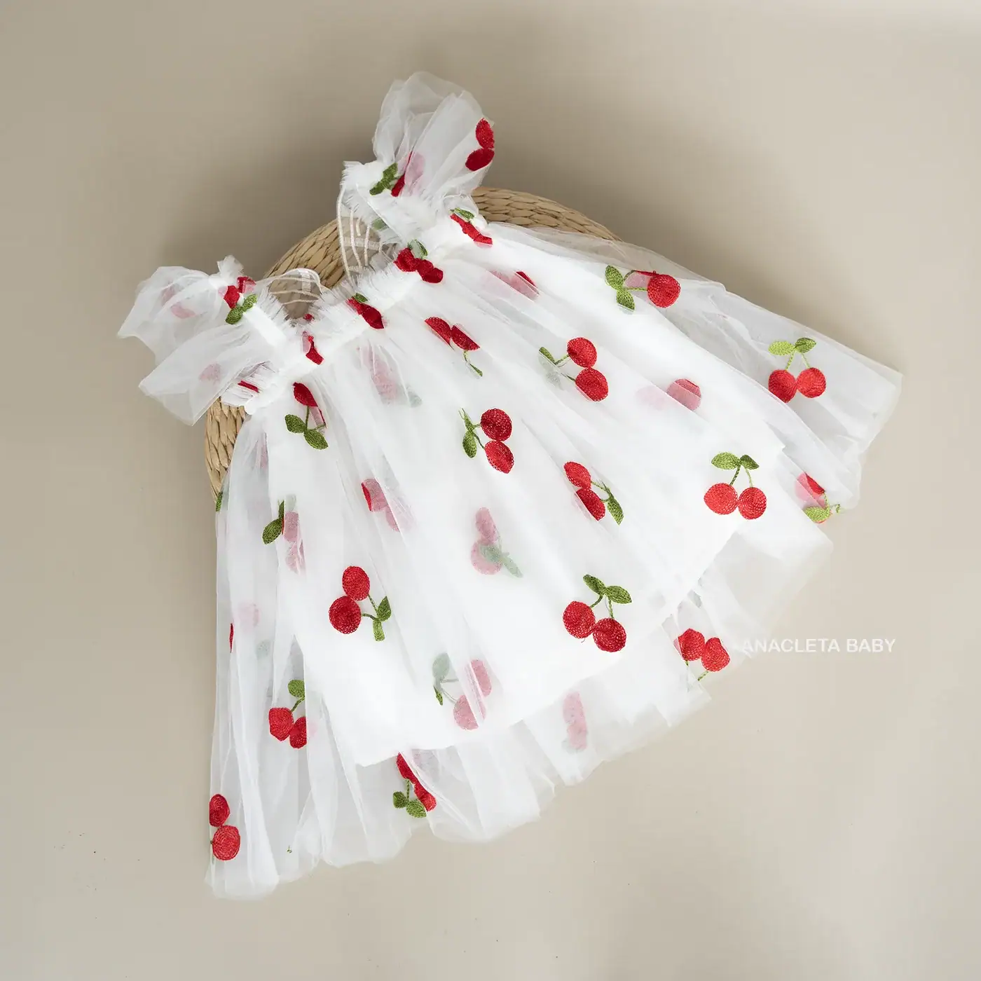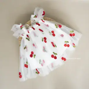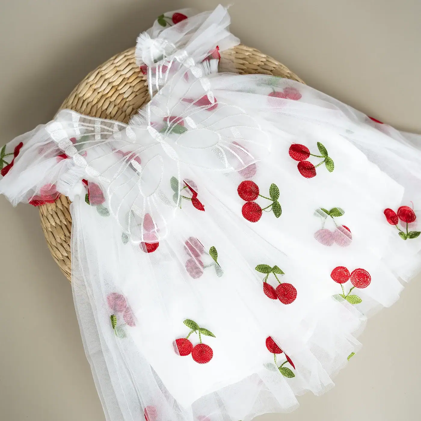 vestido con delicado bordado de cerezas, confeccionado en suave tul y forrado con algodón para mayor comodidad