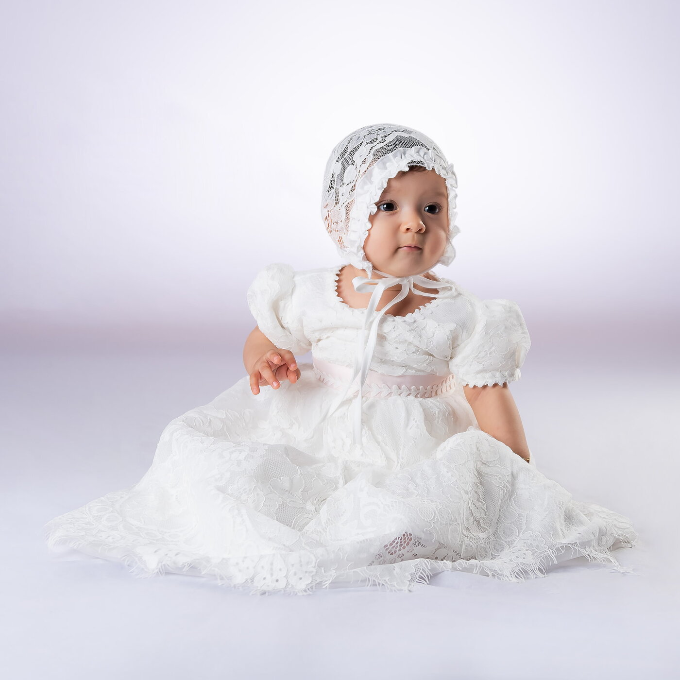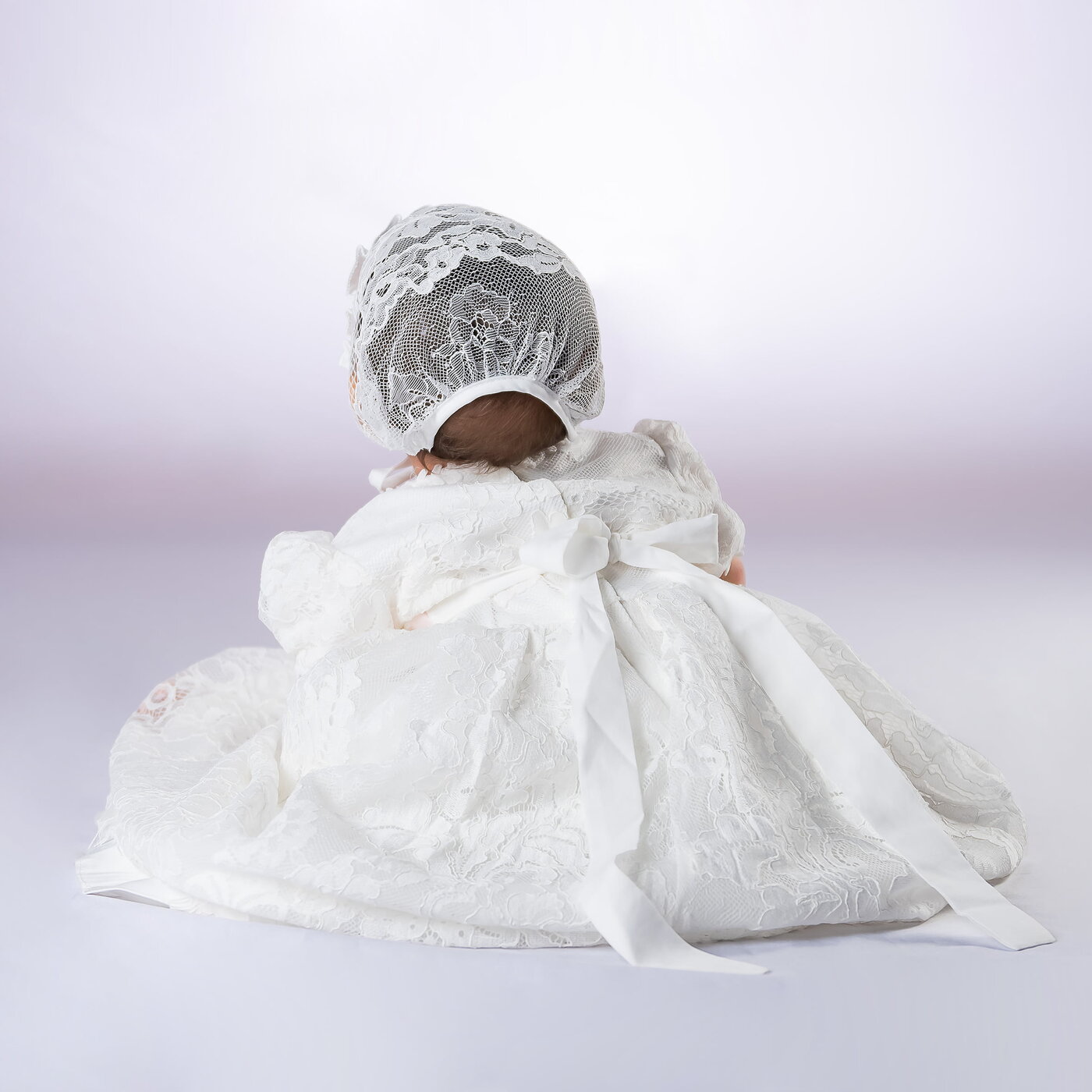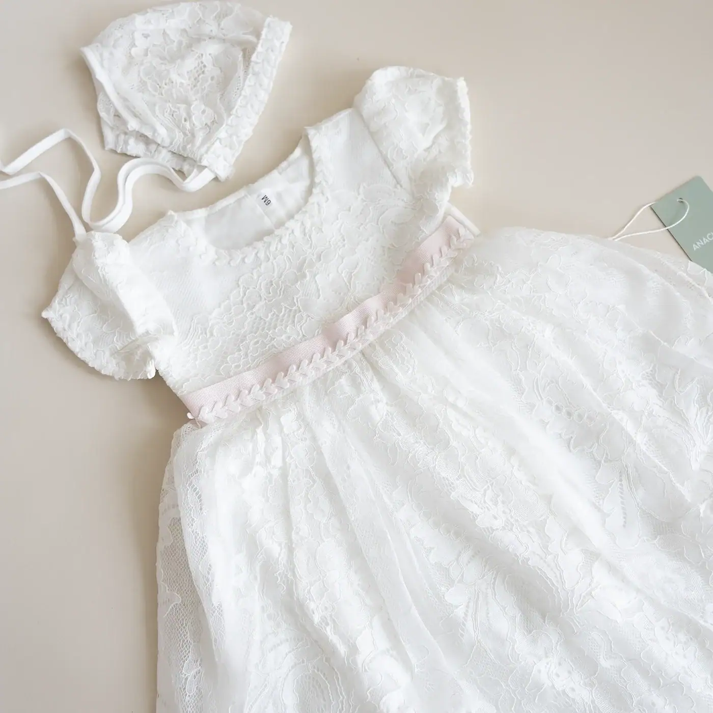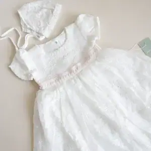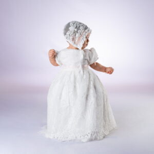 Faldón de bautizo hecho con encaje y algodón suave, ideal para la piel delicada del bebé. Es cómodo, elegante y perfecto para un día tan especial. Incluye un gorro a juego.