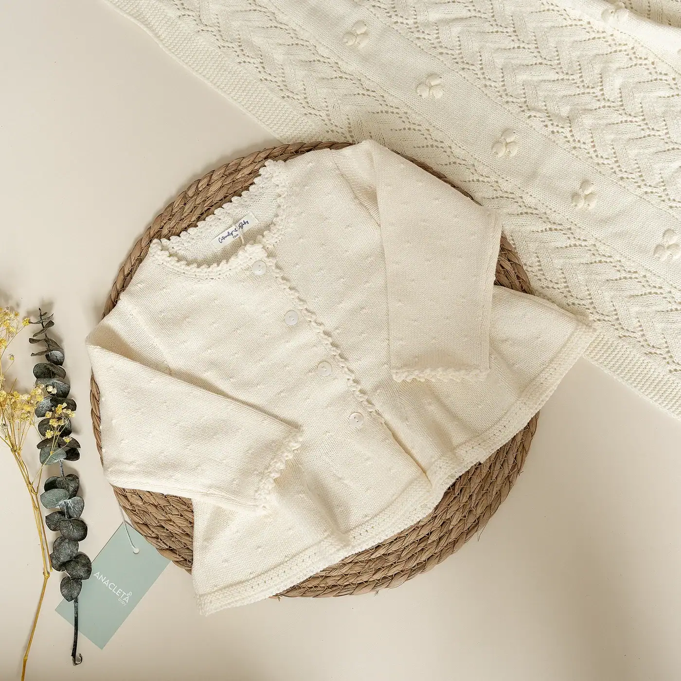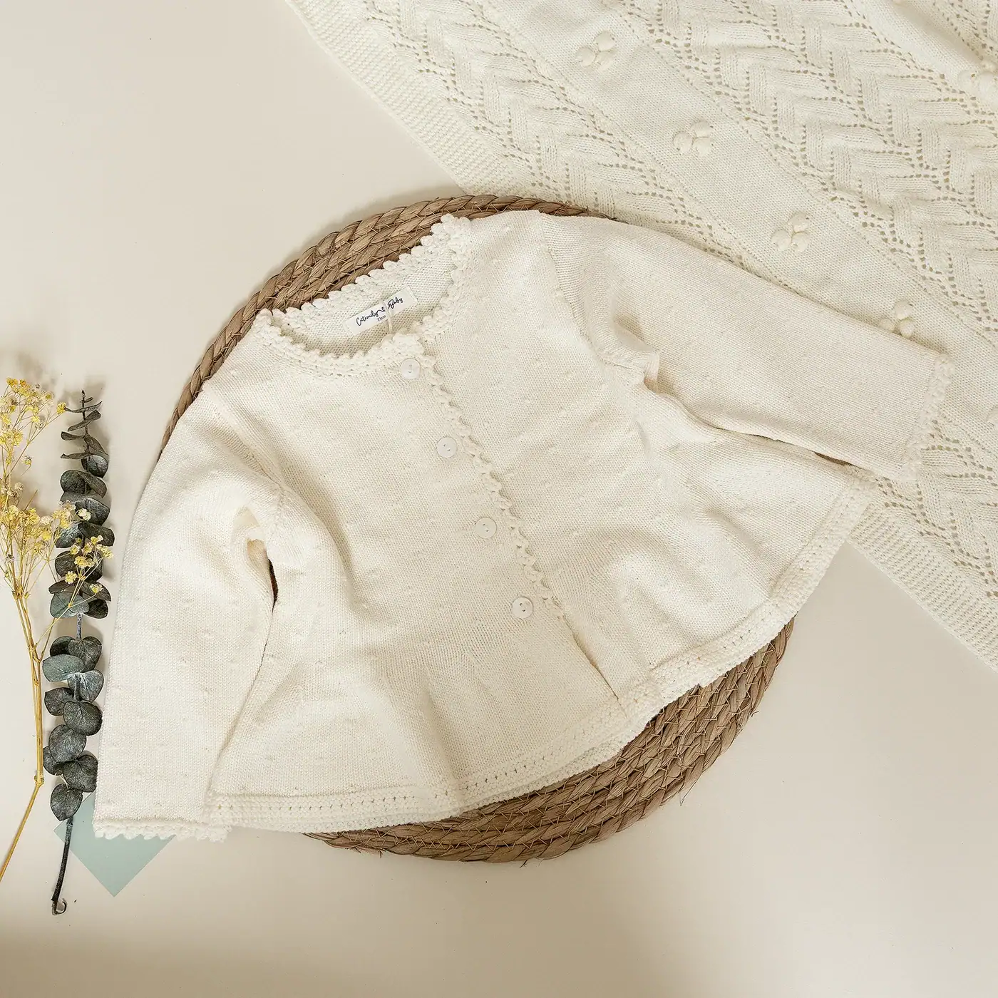 Suéter tejido para bebé en tono beige, suave y delicado, con corte princesa que aporta un toque tierno y elegante