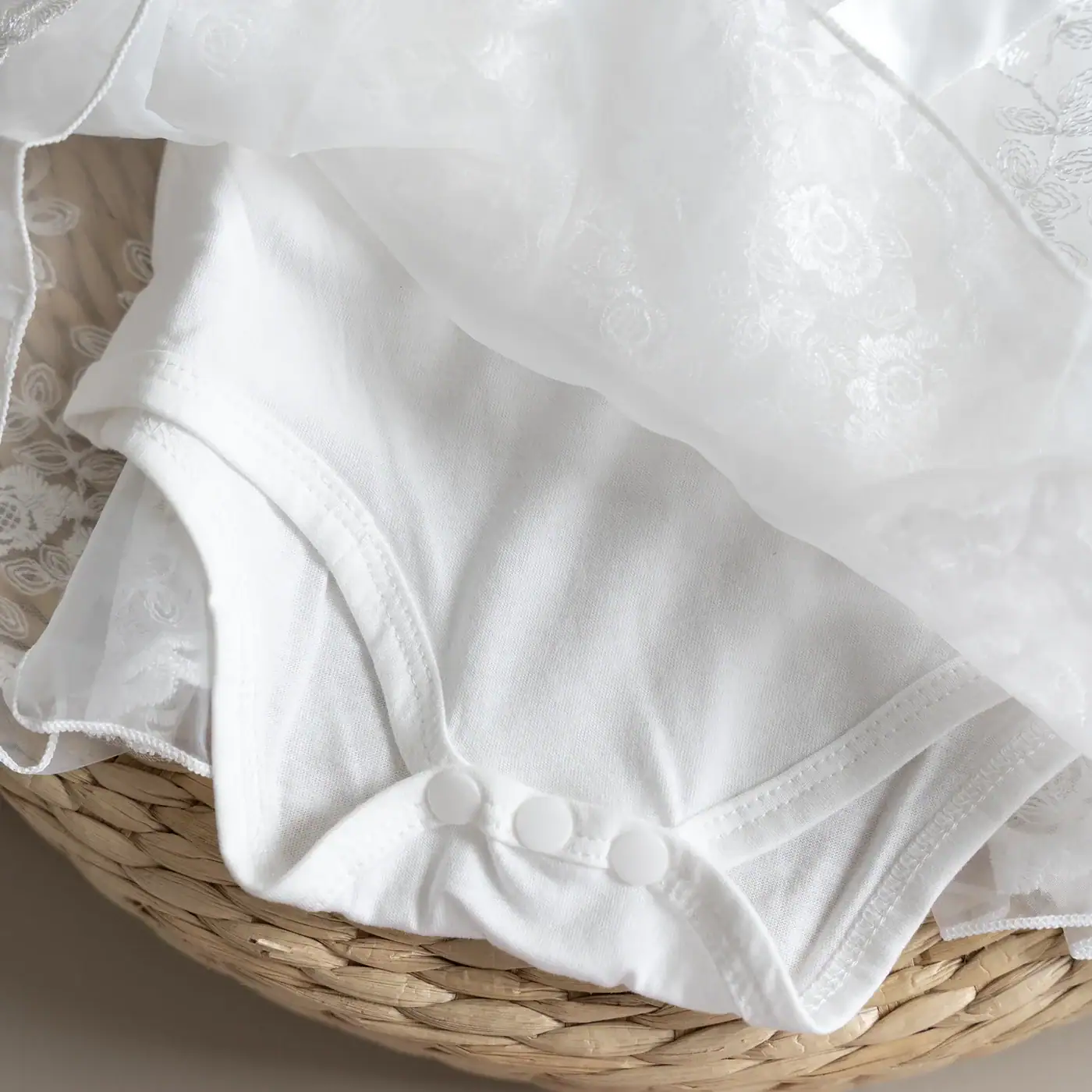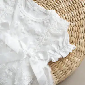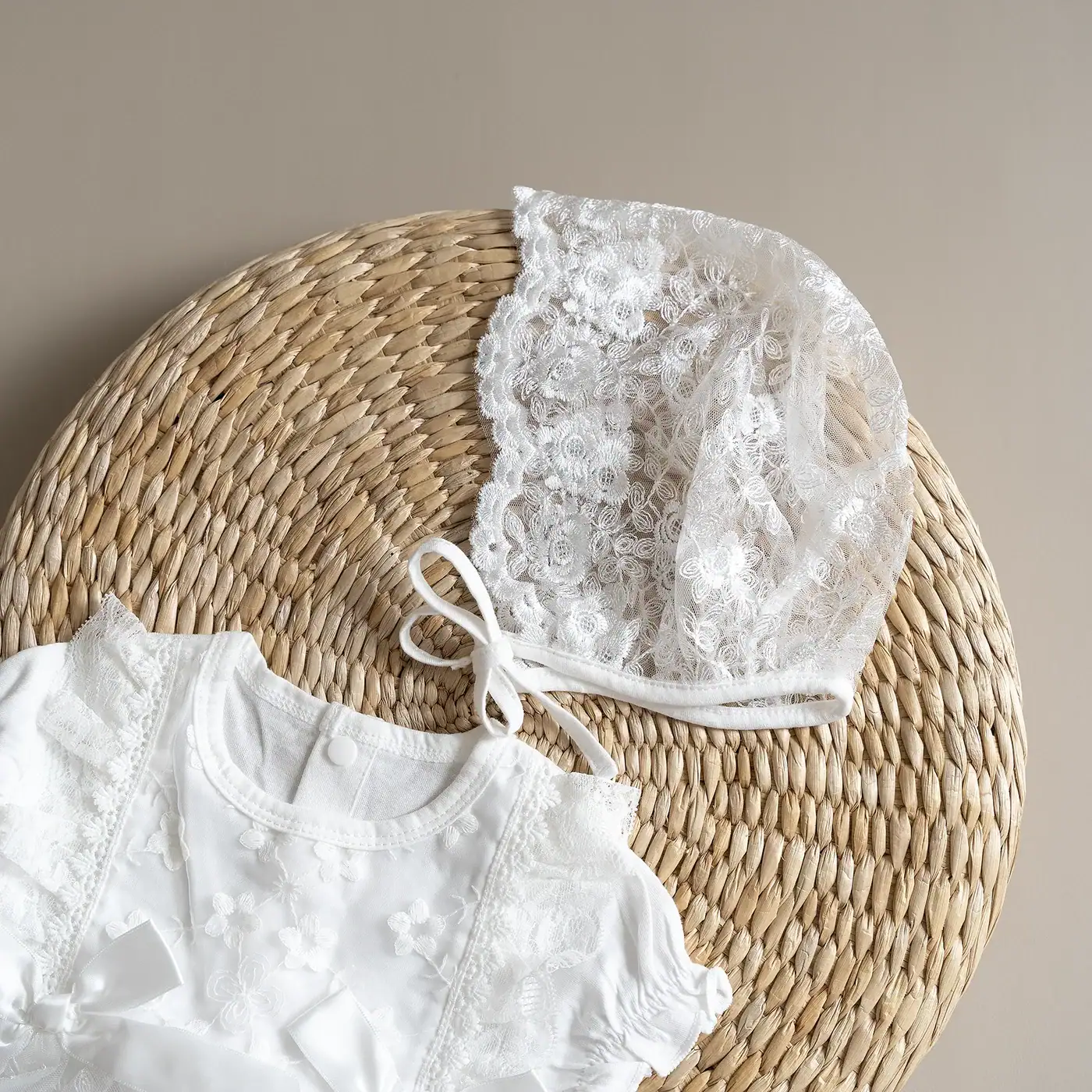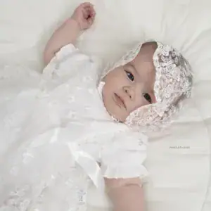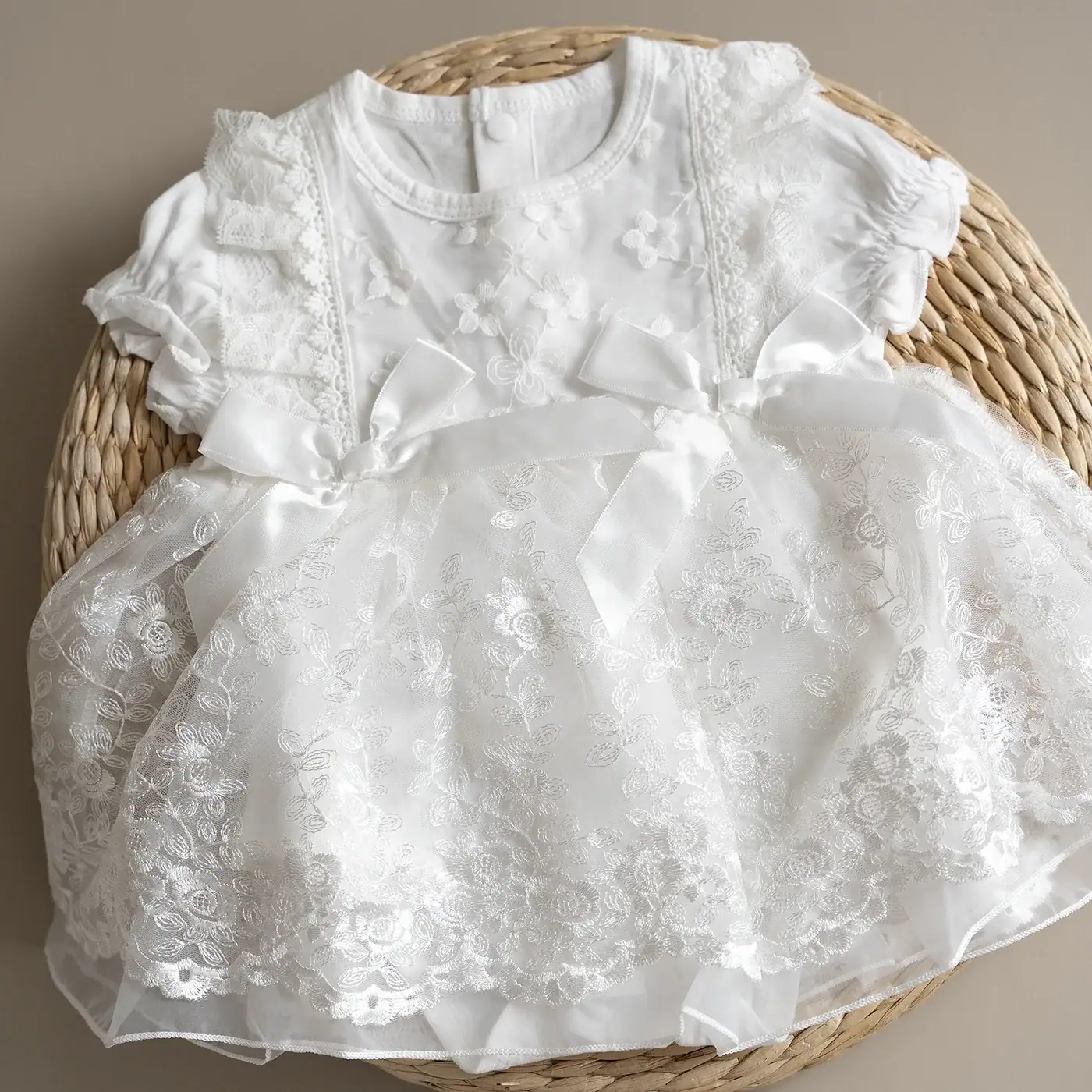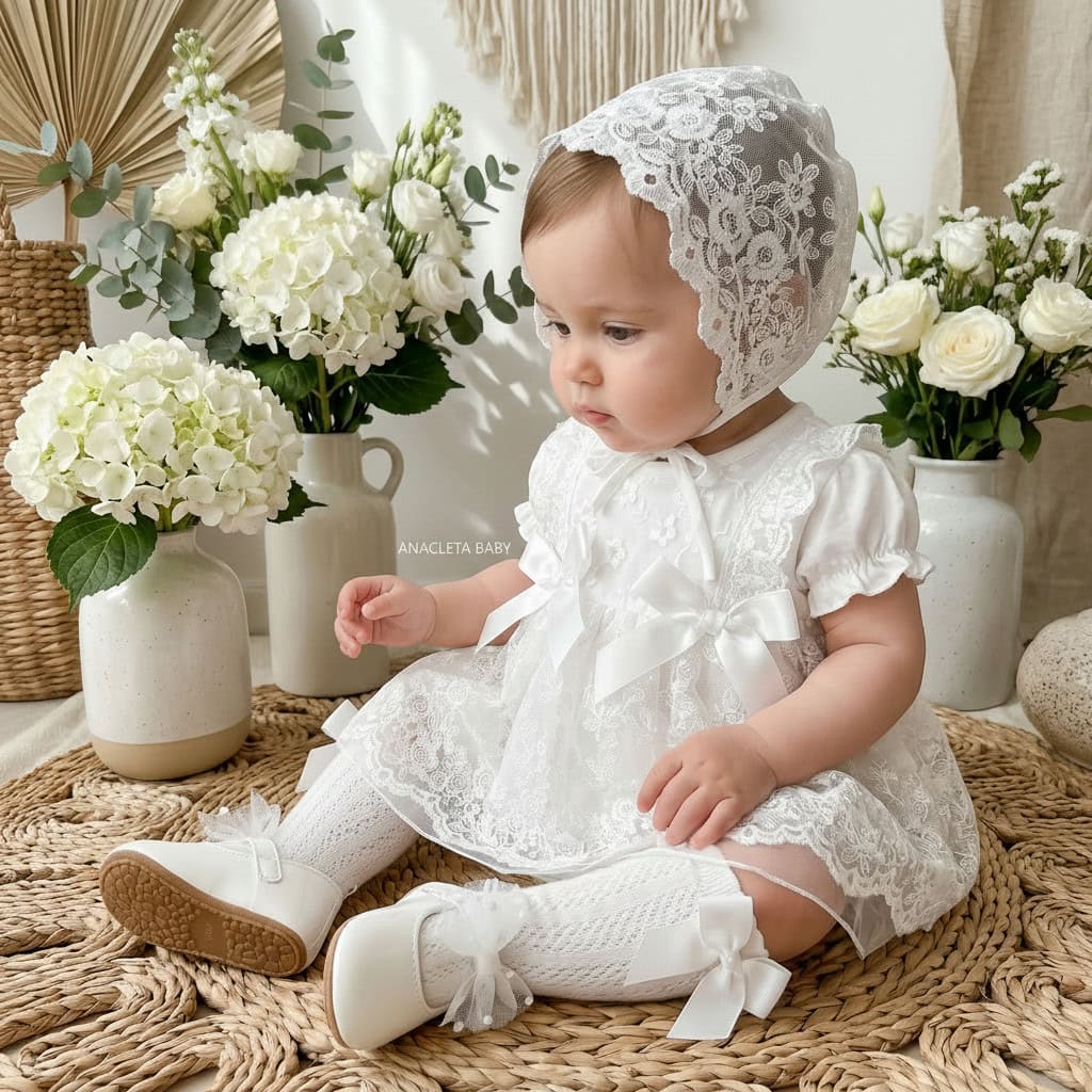 Vestido con body interno de algodón y bordado en encaje de rosas, incluye un gorro a juego, hecho del mismo material