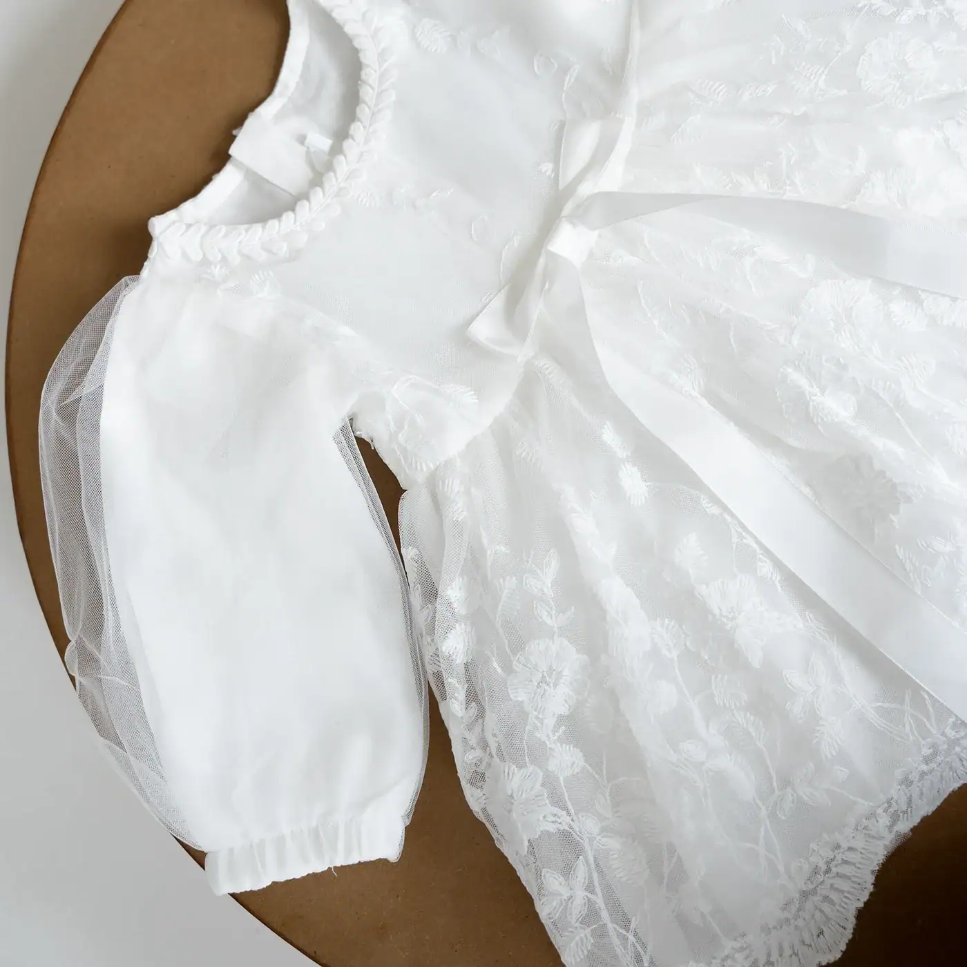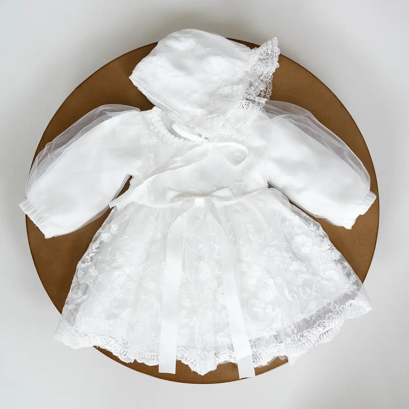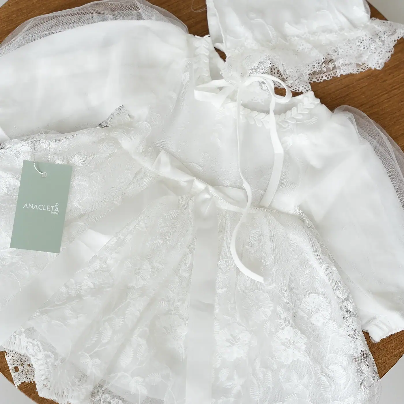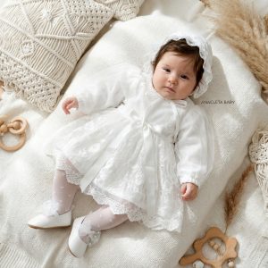 Este encantador conjunto está elaborado con materiales suaves y delicados, como encaje, algodón y tul. El vestido incluye un gorro a juego, ideal para lucir un estilo tierno y elegante.
