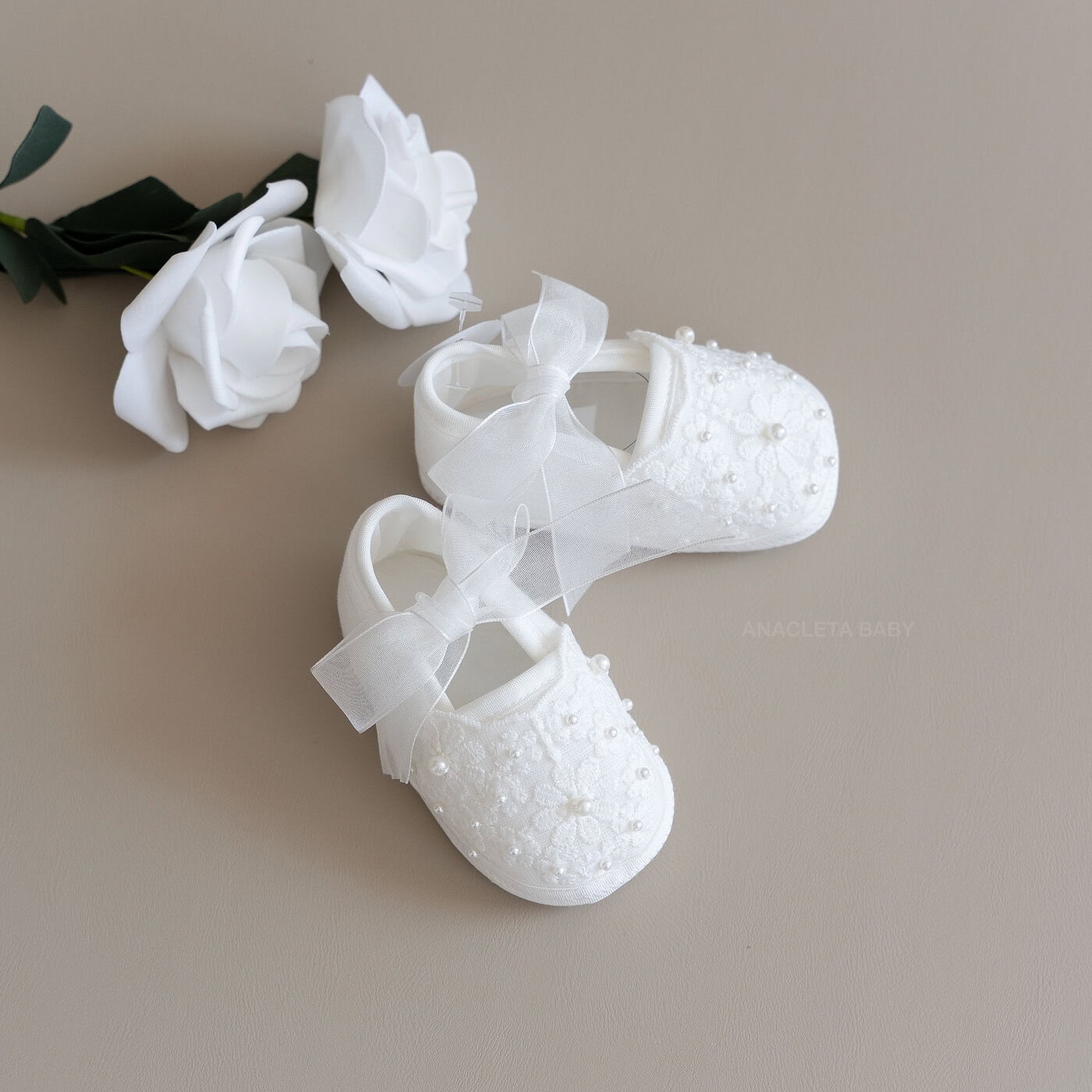 Zapatos diseñados especialmente para recién nacidos y primeros meses, confeccionados con tela suave y delicada, adornados con bordados de encaje y detalles de perlas.